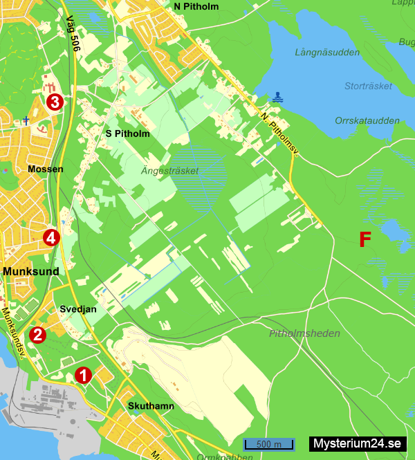 Karta (från 2016) över Piteå / Munksund och platsen där kvarlevorna påträffades år 1993: