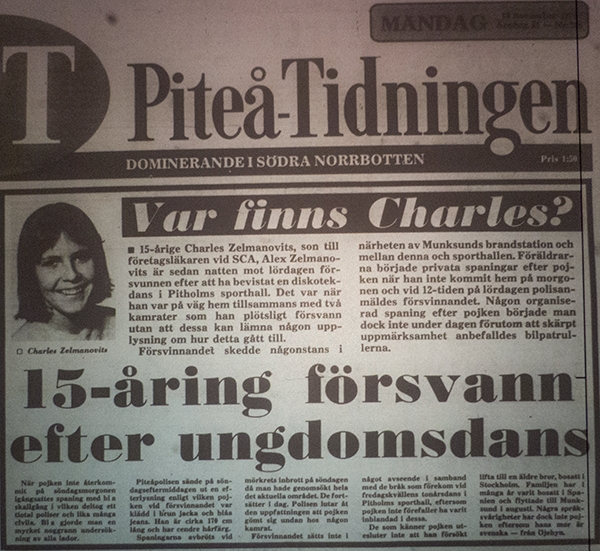 15-årige Charles Zelmanovits försvann spårlöst en kall novembernatt 1976 i Piteå. Hans kvarlevor påträffades i skogen av en jägare sjutton år senare (1993). Dödsorsaken kunde inte fastställas. Brott kunde varken styrkas eller uteslutas.