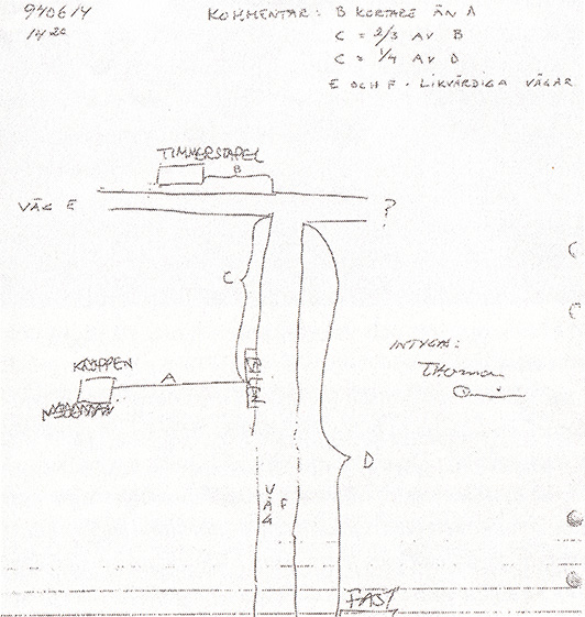 Bild ovan: Quicks skiss av fyndplatsens läge. Några beteckningar i skissen: ”Väg”, ”Timmerstapel”, ”Kroppen”, ”Bilen”, ”FAST” (=huset som låg utom synhåll från bilen och fyndplatsen).