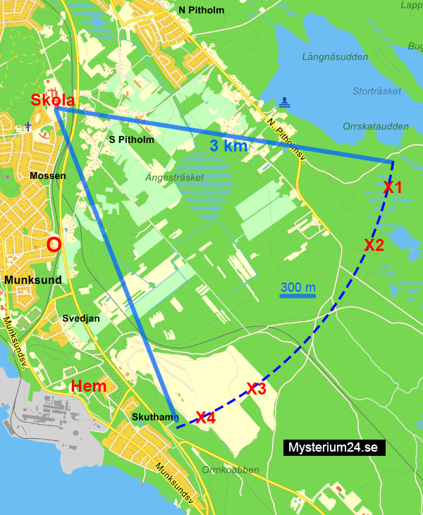 Karta ovan: X1 till X4 ligger var och en ca 300 meter från närmaste väg. Plats X2 är mest troliga fyndplatsen, eftersom X1 ligger i ett träskliknande område och X3/X4 ligger inte i skog.