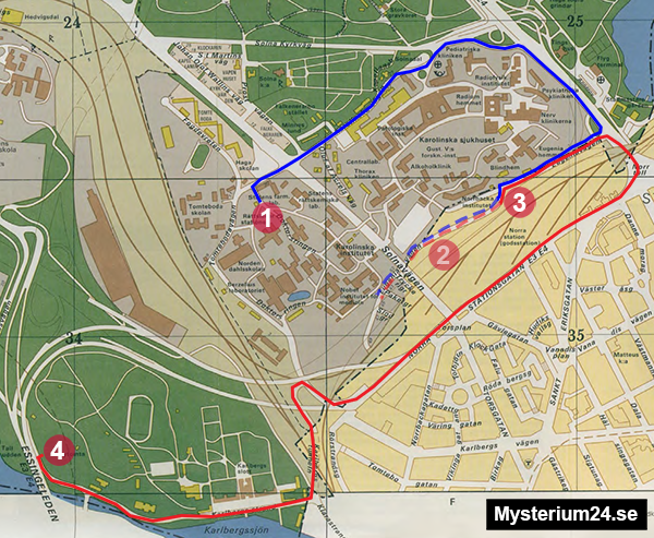 Nedanstående karta visar hur gm (gärningsmannen/-männen) kan ha färdats när säckarna dumpades vid Eugeniavägens industriområde samt vid Karlbergsparken (Ekelundsvägen). Vägbeskrivningen utgår från domen gällande den s.k. ’obducenten’ och ’allmänläkaren’.