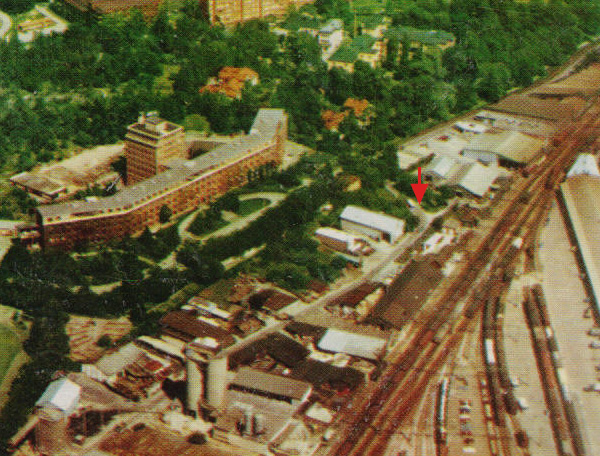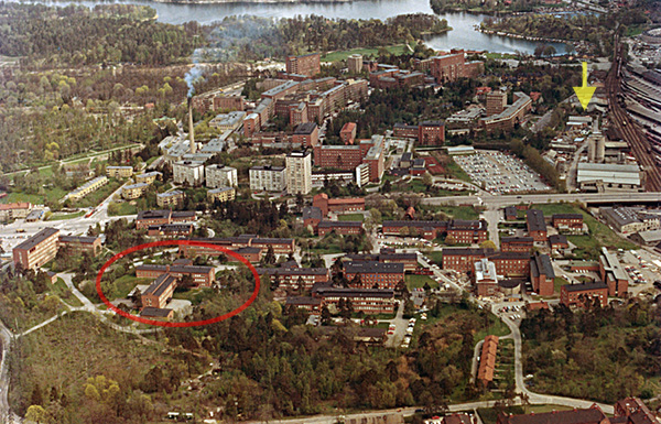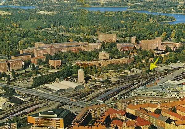 Bild ovan: röd ring=rättsläkarstationen. Gul pil=dumpningsplats Eugeniavägen. Sett från sydväst. 1968?