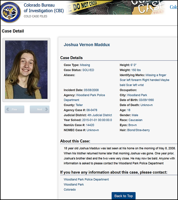 Artonårige Josh (Joshua) Maddux, 183 cm, 68 kg, försvann spårlöst den 8 maj 2008. Han lämnade hemmet på morgonen och återkom aldrig. Sju år senare, i augusti 2015, när en ödestuga revs 1,5 kilometer från pojkens hem hittades hans kvarlevor i den lilla stugans skorsten.