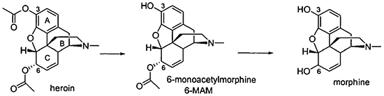 Nutida fakta är att heroin omvandlas till s.k. 6-MAM, ”6-monoacetyl-morfin”, inom 10-15 minuter efter injicering, och därefter till morfin inom några timmar. Vid förekomst av 6-MAM vet man med säkerhet att personen tagit heroin. Man kan säga att 6-MAM är en heroinmarkör.