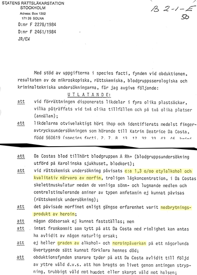 Med rättsläkaren Jovan Rajs analys från 1984 sedd i annat ljus – dvs efter att världen begåvats med ytterligare några decenniers erfarenhet inom rättskemi – så kan det vara mer troligt att Catrine da Costas dödsorsak var en överdos heroin.