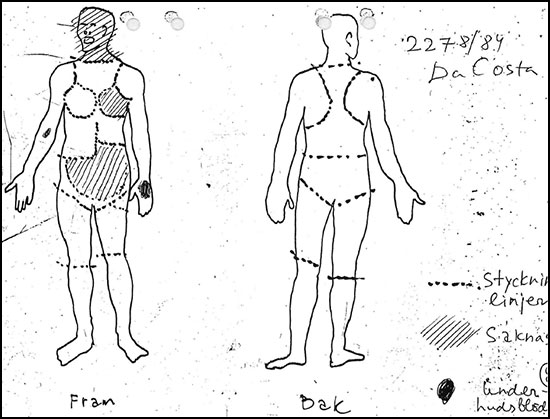 På skissen ovan från obduktionsrapporten är streckskuggade områden delar som aldrig återfanns. Anledningen till vissa av momenten kan vara följande: