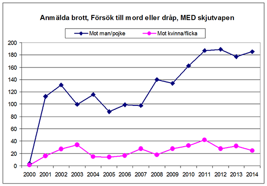 Nedan: Försök till mord eller dråp, med skjutvapen, mot man respektive kvinna: