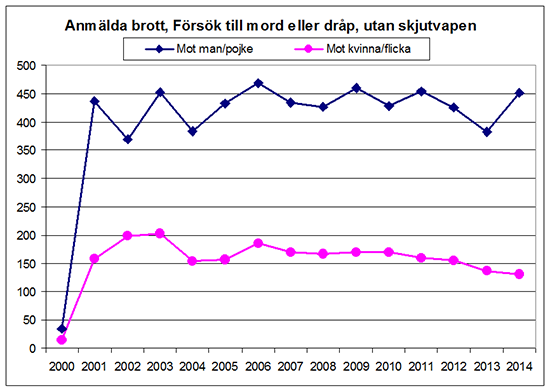 Ang. statistiken före 2000: ”BRÅ har gjort stora omläggningar av sitt statistiksystem som har lett till både tillfälliga och permanenta förändringar i brottsstatistiken. I viss mån påverkar detta statistiken för år 1999. Den största förändringen är att BRÅ från och med slutet av år 1999 direkt inhämtar uppgifter från polisens och åklagarnas ärendesystem.” (BRÅ).