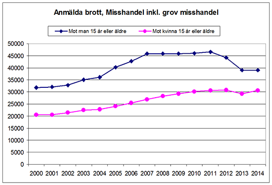 Även misshandel mot män anmäls i betydligt större utsträckning än mot kvinnor. Skillnaden mellan könen i antal anmälningar tycks minskat senare år.
