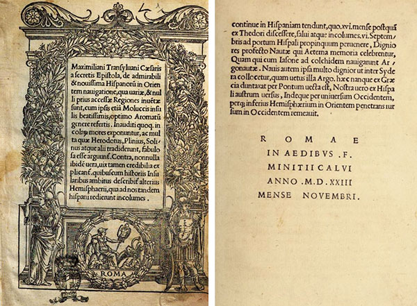 Ovan: första och sista sidan i boken från 1523 om Magellan.