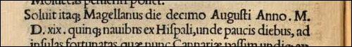 Ovan, ur boken: den 10 (”decimo”) augusti år 1519 (”MDXIX”) avseglade Magellan från Sevilla (”Hispali”) med fem fartyg (”quinq nauib”).