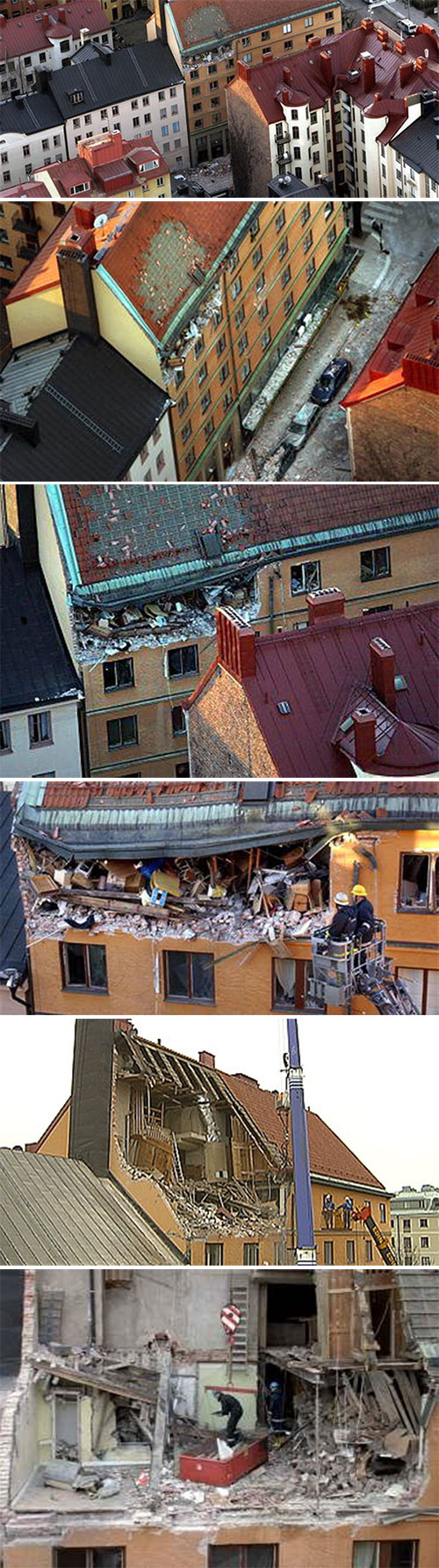 Ovanstående bildcollage: den sprängda tvårumslägenheten i översta våningen på Surbrunnsgatan 45 (femte lägenhetsvåningen) i Stockholm.