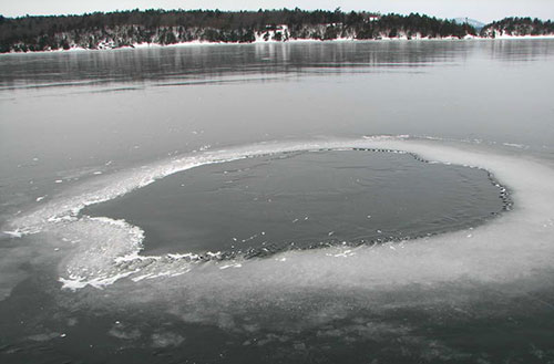 Älven var isbelagd, med ganska tjock is som bar både folk och kreatur. Det fanns en stor, naturlig vak strax utanför stigen mot familjens hus. Kan ha sett ut ungefär så här: