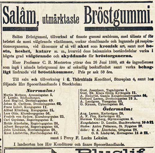 Till salu och tillverkning i G. Thörnblads Konditori, Stureplan4, samt hos följande Hrr Specerihandlande i Stockholm: […] samt i Percy F. Lucks Lokaler.