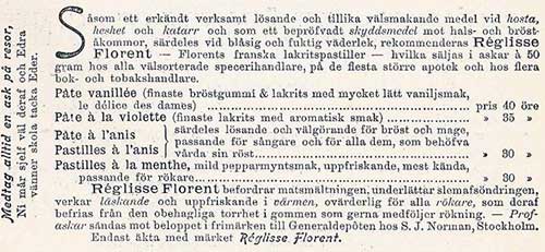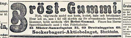 Nytt välgörande medel mot hosta, heshet, hals- och bröstkatarr. Hvar och en, som i tid vill skydda sig för ofvannämnda besvärande åkommor, torde använda vårt Bröst-Gummi. Finnes hos Herrar Specerihandlande samt i våra Fabriksbodar: 35 Mäster-Samuelsgatan 35, 69 Drottninggatan 69. Sockerbageri-Aktiebolaget, Stockholm”