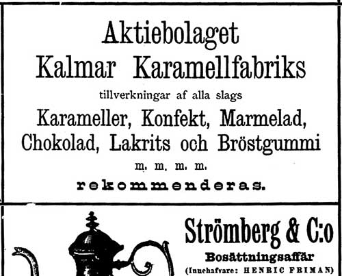 ”Aktiebolaget Kalmar Karamellfabriks tillverkningar af alla slags Karameller, Konfekt, Marmelad, Chokolad, Lakrits och Bröstgummi m.m. m.m. rekommenderas.”