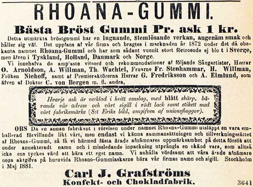 OBS Då en annan fabrikant i rörelsen under namnet Rhoana-Gummi utsläppt en vara emballerad förvillande likt vårt, men endast vi känna sammansättningen och tillverkningssättet af Rhoana-Gummi, så få vi härmed fästa ärade afnämnares uppmärksamhet på detta försök att under annekteradt namn och i missledande inpackning utprångla en okänd vara, som alltså icke ens tyckes värd att bära ett eget namn. Vi anhålla vördsamt att våra ärade afnämare noga aktgifva på huruvida Rhoano-Gummiaskarne bära vår firmas namn och sigill. Stockholm i Maj 1881.