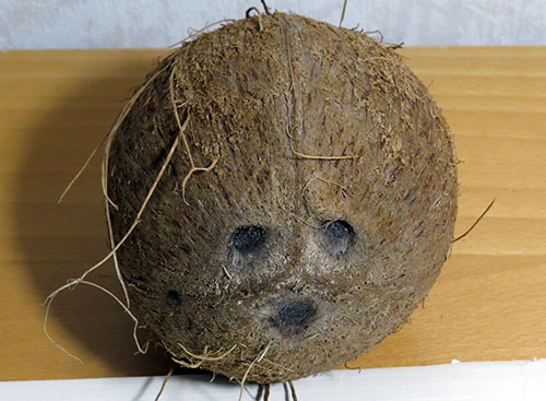 I kokosnötens ena ände, eller kring ena ”polen”, brukar finnas tre små gropar, eller med lite fantasi två ögon och en mun. Åtminstone en av dessa tre gropar är enkelt att penetrera med ett långsmalt föremål som inte ens behöver vara vasst, exempelvis skaftet på en kaffesked (som bilden ovan), eller en stor skruvmejsel. Då kommer man direkt till kokosen utan att genomtränga hårt skal.