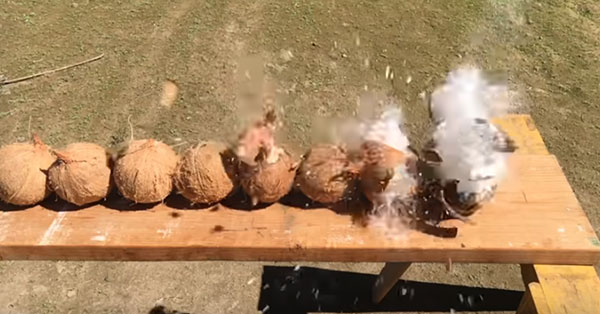Med en 9 mm helmantlad kula (full metal jacket) och pistol Glock 17 öppnas fyra kokosnötter på en och samma gång: