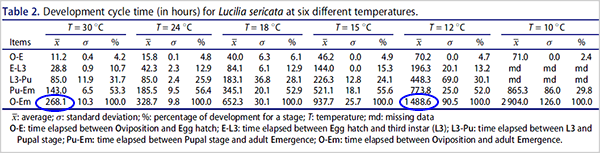 De blå-inringade värdena är tiden i timmar från ägg till fluga vid 30 respektive 12 grader (C) lufttemperatur. Det är stor skillnad i tid beroende på temperatur: