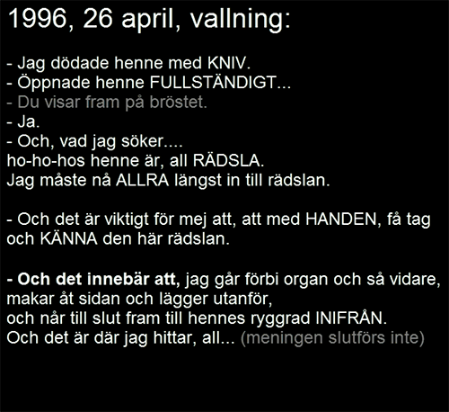 I andra klippet, från en vallning den 26 april 1996, är Quick upprörd, skakar och darrar på rösten, när han förklarar hur han med kniv dödade och skar upp en liten flicka. I tredje klippet, från samma dag, skriker Quick på sig själv.