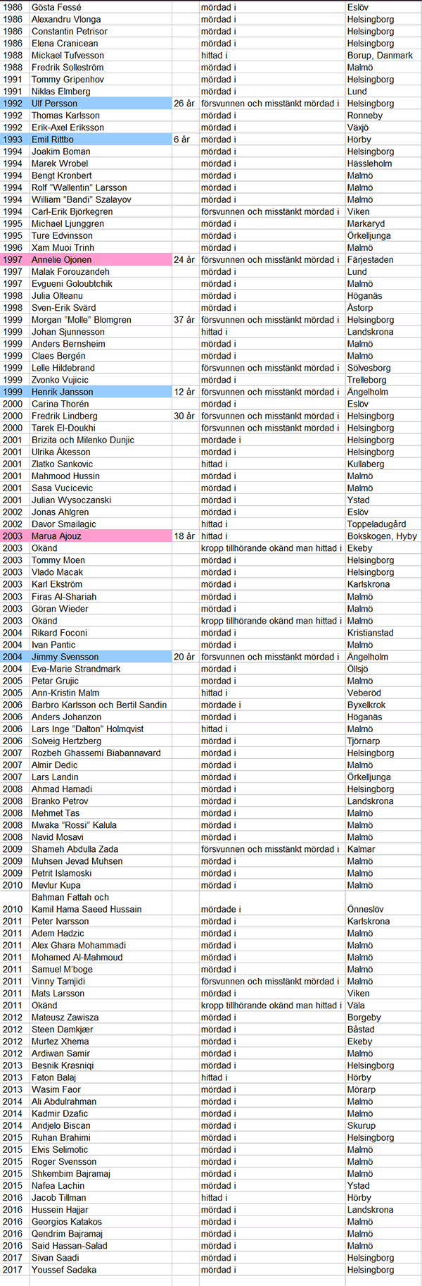 Lista med drygt hundra ouppklarade mord, försvinnanden och misstänkta mord, samt några oidentifierade personer. Från södra Sverige åren 1986 till 2017.
