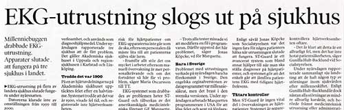 ”(…) EKG-utrustning på flera av landets sjukhus slutade fungera under nyårsnatten. Datorerna klarade inte av omställningen från 1999 till 2000.”