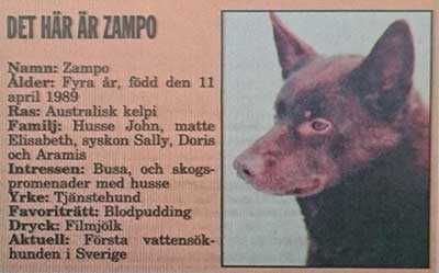 ”Zampo står i fören på båten med nosen i vädret. Biter i vattnet. När han får vittring på Expressens grodmansfotograf börjar han skälla. Genom att bita i vattenytan markerar han för John var grodmannen döljer sig.” (1993-04-25, Expressen).