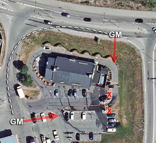 Flygfoto ovan: enligt media* avlossades flera skottsalvor från två håll. Efter de första skottsalvorna förflyttades bilen hundra meter och skjutandet fortsatte. (GM=gärningsmän. Pilarna visar skottriktningarna. X=kulhål).