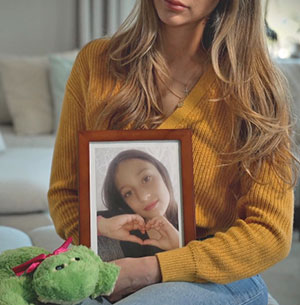 Mamman med Adrianas foto i knät.