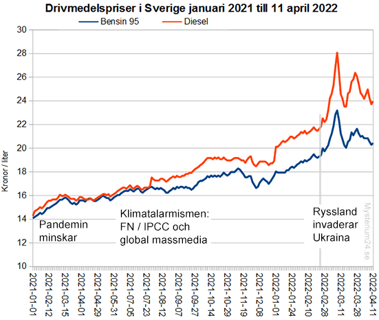 Prisökningarna (t.ex. på drivmedel och livsmedel) sedan 2021 och framåt beror bland annat* på den globala klimatalarmismen, som fick nytt bränsle våren 2021.