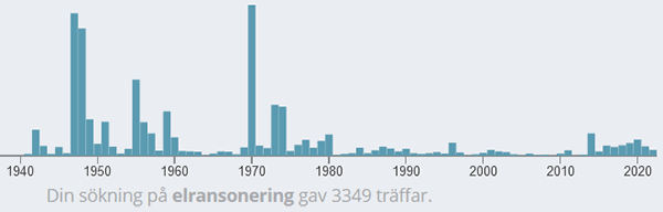 Bild ovan: relativa antalet tidningssidor som innehåller ordet ”elransonering” (skärmbild från KB:s söktjänst*).