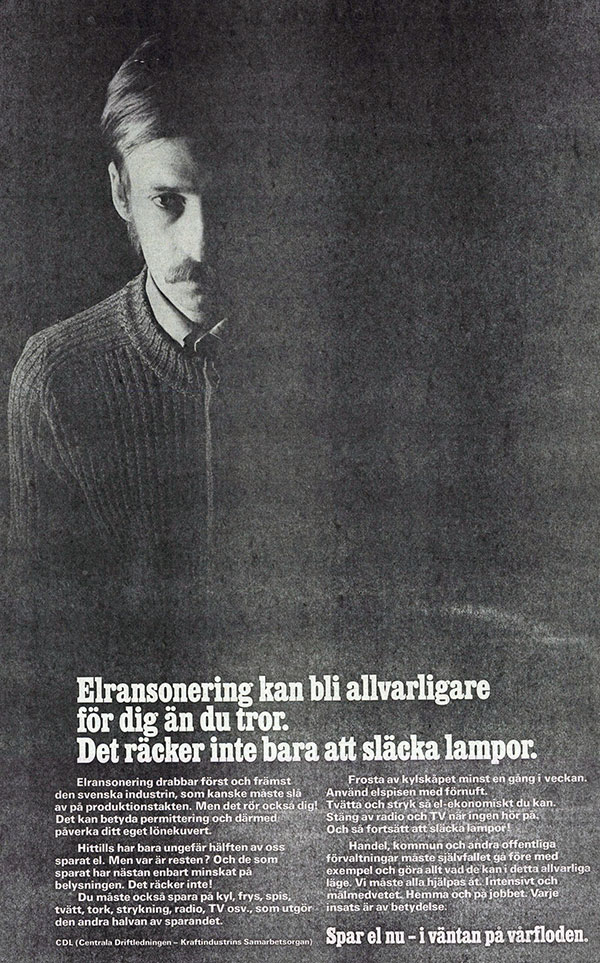 Ur helsidesannons i flera dags- och kvällstidningar april 1970. En man sitter i kolmörkret och väntar på vårfloden… så att vattenkraftverk kan generera elektricitet så att stackar’n kan tända lamporna, se på tv, ladda mobilen, surfa, duscha i varmvatten, med mera.