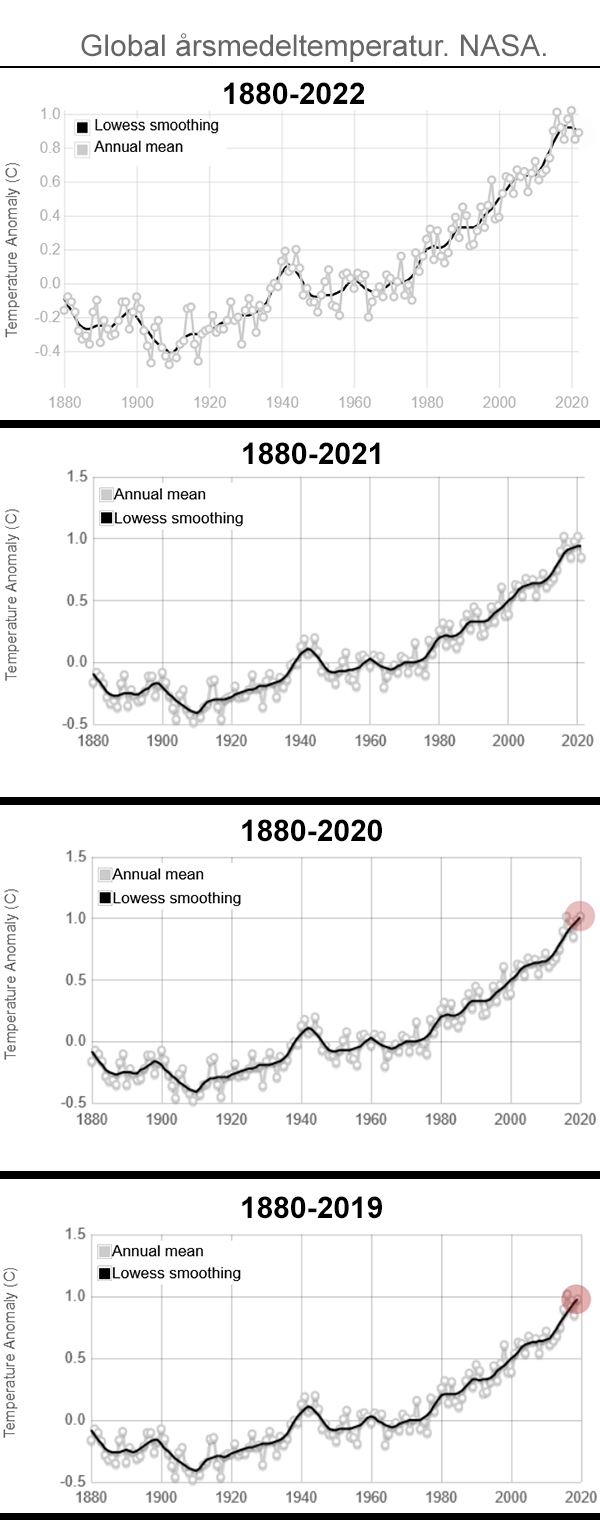 överst är NASA:s senaste diagram* (åren 1880-2022), därunder några av de föregående årens diagram (1880-2021, -2020 och nederst -2019).