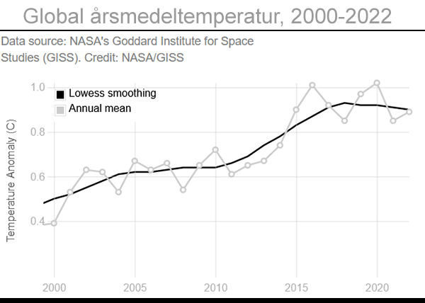 Bild ovan: NASA:s globala årsmedeltemperatur* år 2000-2022 (hämtat ur NASA:s diagram 1880-2022 med deras zoom-funktion). Trendkurvan (svart) beräknas av NASA ur årsvärdena (grått).